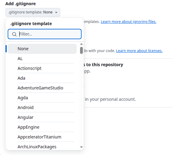 .gitignorebasé sur template. Choisissez le langage principal de votre projet. Cela évite d’avoir un créer de toutes pièces un fichier complexe. Vous pouvez voir tous les templates sur ce dépôt.